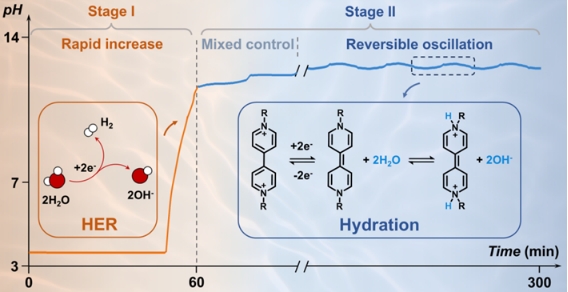 针对上述问题,西安交通大学宋江选教授团队通过构建了集原位pH监测、气相色谱分析与电化学性能测试于一体的多模态测试平台,首次系统揭示了紫精负极的两阶段碱化机制。研究发现,初始阶段的碱化由低电位下的析氢反应主导,引起体系pH值的不可逆上升;随后阶段则源于季铵氮与吡啶氮位点之间的可逆结构转化,造成持续的pH振荡行为。基于这一机理认识,团队通过高浓度支持电解质体系验证了调控策略的有效性,在两电子转移条件下实现了66.9 Wh Lanolyte-1的能量密度;经过200次循环后,电池容量保持率达99.25% /天,展现出优异的循环稳定性。该研究不仅深化了对紫精类电解液碱化起源的理解,也为设计高耐久性水系有机液流电池电解质提供了具有普适意义的理论框架。