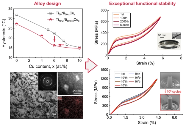 TiNi基合金因其优异的形状记忆效应和超弹性等特性,在航空航天、机器人、医疗器械和固态制冷等领域展现出广阔的应用前景。然而,传统TiNi基合金普遍面临“大功能响应”与“高循环稳定性”难以兼顾的挑战,即在呈现较大可回复应变或显著弹热效应时,材料易发生性能衰减,严重制约其长期可靠应用。因此,如何在大功能响应与高循环稳定性之间实现协同优化,已成为形状记忆合金领域亟待突破的一个瓶颈问题。