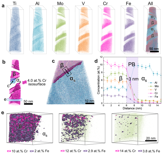 这种极致的强度-塑性性能主要得益于精心设计的“纳米孪生α析出相+超细β亚晶”微观组织结构(图2)。其中,由ω前驱体介导的高密度纳米级α析出相不仅具有显著的强化效应,而且α相之间形成孪生对,通过共格孪晶界有效缓解半共格α/β界面的应变不相容性,进而提高塑性。同时,超细β亚晶界扮演多重功能:除了在塑性变形过程中阻碍位错运动并协调塑性变形,在时效过程中β亚晶界促进非连续的纳米α片析出。与传统β晶界处析出的连续晶界α膜不同,这种非连续的亚晶界纳米α片不仅可以作为位错源发射位错促进塑性变形,还可以阻碍位错滑移以增加应变硬化率提高均匀延伸率。塑性变形过程中,高应力驱动的化学异质性(图3)能够与位错产生强烈的相互作用,使位错运动变得“迟缓”,增加位错间交互作用的机会,这有利于提高材料的加工硬化能力,延缓颈缩发生。