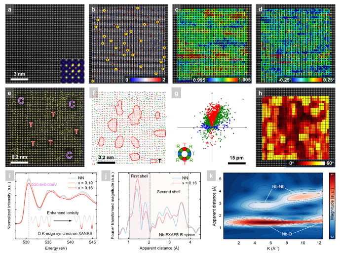 通过同步辐射X射线吸收谱(XAS)与高角环形暗场扫描透射电镜(HAADF-STEM),研究团队首次在介电材料中观测到亚埃级电子云位移,并证明其通过增强Nb–O键离子性、均匀化键长分布,显著提升了极化切换速度与储能效率。