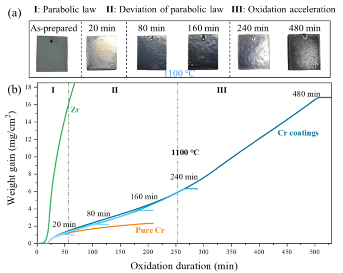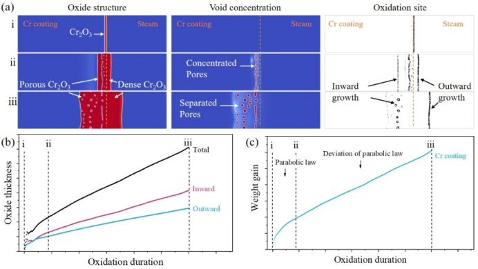 西安交通大学金属材料强度全国重点实验室孙军院士团队通过原位热重分析、多尺度微观表征与相场模拟相结合的系统研究方法,揭示了微孔主导Cr涂层高温氧化动力学转变的核心机制,为评估Cr涂层在冷却剂损失事故(Loss-Of-Coolant Accident,LOCA)条件下的结构完整性和防护性能提供了全新的视角。