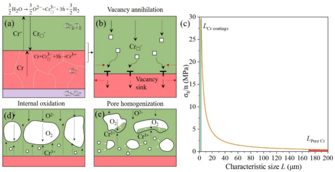图3蒸气环境下Cr2O3孔洞形成机制。(a)阳离子空位聚集,(b)-(c)高背应力的Cr涂层导致Cr/Cr2O3界面处空位湮灭效率降低引发孔洞形成,(d)孔洞阻止金属阳离子向上扩散,(e)孔洞均匀化过程。