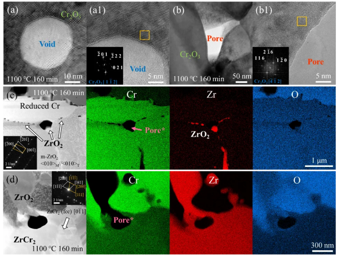 图2在1100 ℃水蒸气中氧化160 min后Cr2O3及Cr涂层中孔洞结构特点: (a),(a1),(b),(b1)纳米级和微米级孔洞结构,(c) Cr2O3-Zr氧化还原反应引发Cr涂层晶界处形成孔洞,(d)柯肯达尔效应导致Cr涂层/Cr-Zr扩散层界面形成孔洞