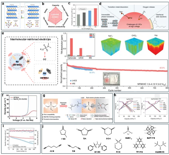 图2.层状氧化物正极所面临的挑战及电解液改性策略、关键性能指标雷达图、充电截止电压与全电池能量密度的关系以及主要挑战。薛伟江课题组提出的分子间增强磺酰胺基电解液的溶剂化结构,及其对高电压钠离子软包电池中过渡金属溶解的拟制和界面稳定的机制(e)