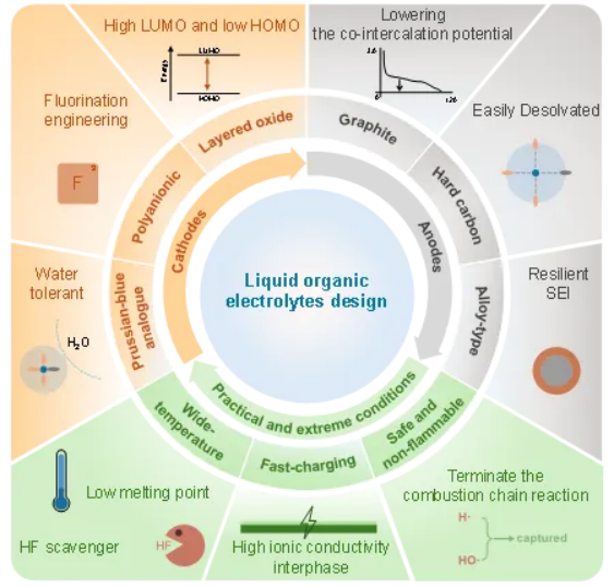 图1.匹配不同电极与运行需求的钠离子电池电解液设计概述