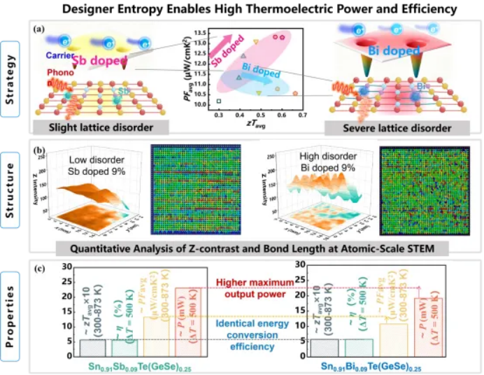 研究团队以SnTe(GeSe)0.25为模型基体,系统对比了两条截然不同的合金化路径:掺杂原子半径与Sn匹配的Sb("温和路径")与原子半径/质量严重失配的Bi("强扰动路径")。结果表明,尽管两者获得了几乎相同的高转换效率(~5.7%,ΔT = 500 K),但Sb掺杂器件的最大输出功率达到23.1mW,较Bi掺杂器件(19.0 mW)提升约20%——在不牺牲效率的前提下显著提升了功率输出。这一工作明确证明了"高zT并不保证高功率",为下一代高功率密度热电材料的设计提供了从"组分复杂度"迈向"组分智能化"的蓝图。