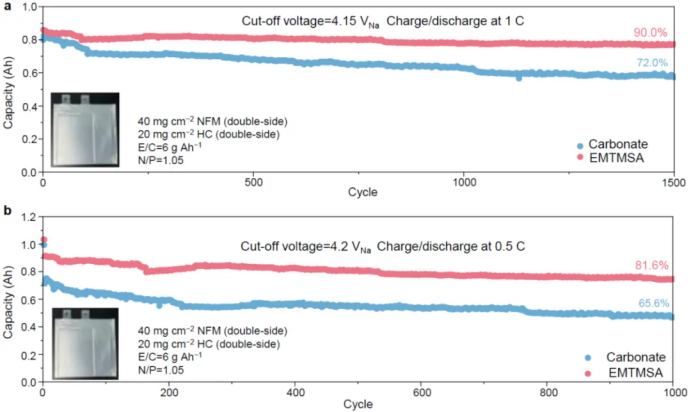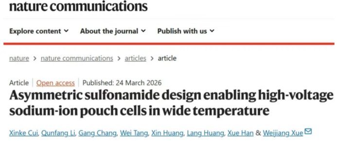 上述成果以《非对称磺酰胺分子设计实现高电压、宽温域钠离子软包电池》《Asymmetric sulfonamide design enabling high-voltage sodium-ion pouch cells in wide temperature》为题发表在国际著名期刊《自然通讯》《Nature Communications》。西安交通大学金属材料强度全国重点实验室为论文第一通讯单位,西安交通大学材料学院博士四年级学生崔新科为第一作者,材料学院薛伟江教授为通讯作者。该工作得到国家重点研发计划的资助和西安交通大学材料学院微纳中心和分析测试中心的鼎力支持。