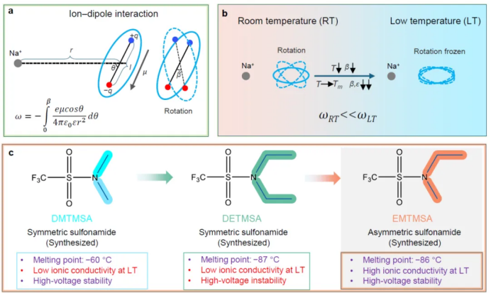 针对上述关键科学问题,西安交大材料学院金属材料强度全国重点实验室微纳中心薛伟江教授课题组提出了一种基于“分子不对称结构设计”的新型磺酰胺电解液分子——N-乙基-N-甲基三氟甲磺酰胺(EMTMSA)。通过在磺酰胺分子中引入不对称烷基取代基,打破凝固时分子晶体的规则堆积,使其熔点降低至−86 °C,从分子层面实现低温流动性与高电压稳定性的协同优化。同时,该分子保留了类盐结构特征,在溶剂化结构中诱导形成以接触离子对和聚集体为主的溶剂化鞘,氧化还原分解时促进构建富无机、低阻抗稳定界