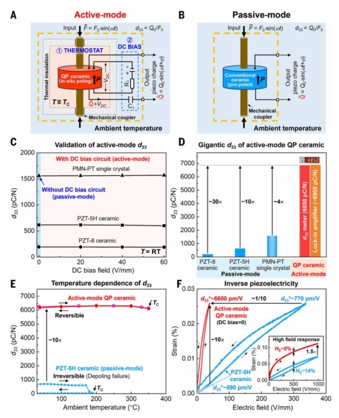 3. 2026年1月29日,任晓兵教授团队联合甬江实验室与日本国立物质材料研究所(NIMS),成功开发出一类成本低廉的"超级压电陶瓷",开创了主动压电器件新范式,实现了压电陶瓷领域的历史性突破。该材料压电系数d₃₃高达6850 pC/N,较传统压电陶瓷提升10-30倍,一举打破了压电材料性能长期徘徊不前的局面,为高端传感、精密驱动与智能交互等战略领域的技术跨越提供了关键材料支撑。相关工作以“Gigantic piezoelectricity in a polycrystalline ceramic actively maintained at a quadruple point”为题在国际顶级学术期刊《科学》上在线发表。