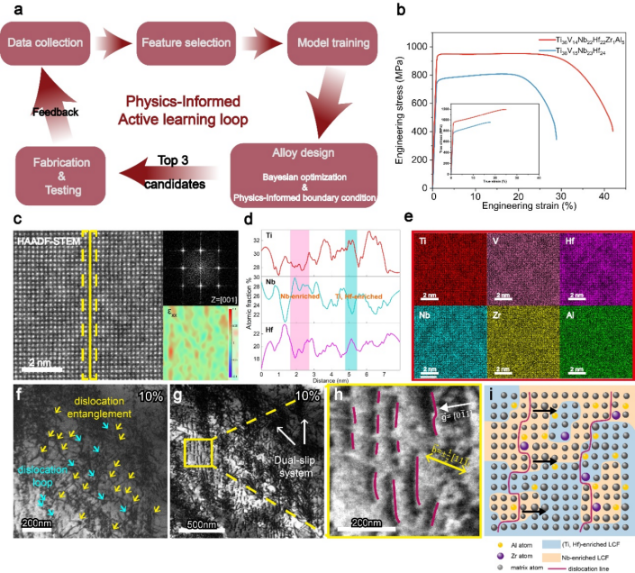 4. 2026年1月29日,刘畅教授和马恩院士团队联合上海交通大学创新性地构建了“物理知识嵌入的主动学习循环”框架。成功实现了GPa级抗拉强度与42%延伸率的突破,为高强韧难熔高熵合金的开发开辟了新路径。相关工作以“Active learning design of bcc solid solution alloys with gigapascal strength and elemental metal-level ductility”为题在国际知名学术期刊《美国科学院院报》上在线发表。