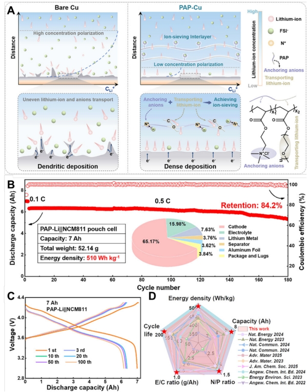 8. 2026年2月16日,宋江选教授团队提出了一种界面离子筛分策略,通过构建界面离子筛分层,成功制备出性能稳定的锂金属负极。基于该负极组装的锂金属软包电池,能量密度达510 Wh kg-1,且在贫电解质(1.19 g Ah-1)和高电流密度(3 mA cm-2)条件下,展现出优异的循环稳定性(84.2%,180次循环),为高比能、长寿命锂金属电池的开发开辟了新路径。相关工作以“Mitigating Concentration Polarization via Ion-Sieving Interlayer Towards Long-Life 510 Wh kg-1Lithium Metal Pouch Cells”为题在国际知名期刊《德国应用化学》上在线发表。
