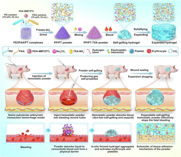 6. 2026年1月29日,郭保林教授团队提出了一种新颖的材料设计:将便携粉末的储存稳定性、液态材料的渗透与贴合性以及固态凝胶的强韧粘附性三者优势合而为一,成功研制出一种超快速自凝胶、自膨胀、自推进、高粘附的促凝止血粉末。在猪致死性锁骨下动/静脉横断模型中,将失血量降低了98%(从591.7 mL降至11.7 mL),并将止血时间缩短了96%(从33 min缩短至1.2 min),为下一代便携式、自适应、多功能急救止血材料开辟了新方向。相关工作以“Ultra-fast self-gelling self-expanding self-propelling high-adhesion procoagulant hemostatic powder for non-compressible hemorrhage hemostasis in pigs”为题在国际知名期刊《自然-通讯》上在线发表。