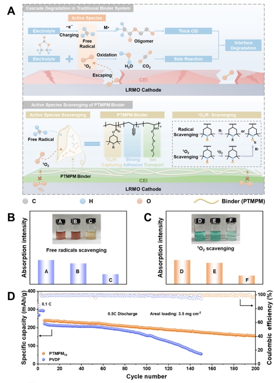 9.2026年3月23日,宋江选教授团队提出了一种单线态氧/自由基靶向清除策略,成功设计出兼具单线态氧捕获与自由基清除双重功能的三嵌段共聚粘结剂。该粘结剂应用于富锂锰基正极锂离子电池后,电池在2.0-4.8 V电压、0.5 C倍率下循环200次,容量衰减率为每圈0.175%,为提升富锂锰基正极电化学性能、完善功能性粘结剂分子设计提供了新思路。相关工作以“Suppressing Cascade Degradation of Lithium-Rich Manganese-Based Cathodes via Singlet Oxygen/Free Radical-Intercepting Binder”为题在国际知名《美国化学会志》上在线发表。