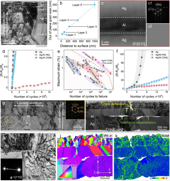 1. 2026年1月2日,吴凯教授和孙军院士团队创新性地提出了“共格梯度纳米层状结构”设计策略,通过构筑兼具原子级共格界面与逐层梯度过渡特征的金属多层膜,通过在金属薄膜中构建原子级共格界面与梯度层状结构,实现对疲劳裂纹“萌生—扩展”全过程的协同抑制,为柔性导体的长寿命稳定服役提供了全新解决方案。相关工作以“Fatigue-resistant metal-film-based flexible conductors with a coherent gradient nanolayered architecture”为题在国际知名学术期刊《自然-电子》上在线发表。