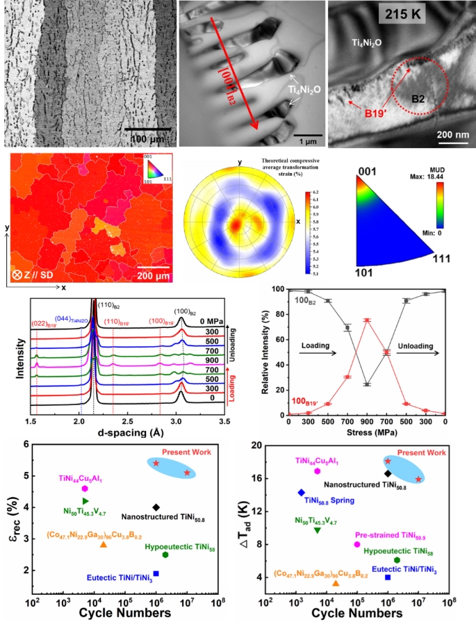 5. 2026年1月29日,丁向东教授与梁强龙副教授团队提出了一种独特的“奥氏体织构-第二相协同效应”创新设计理念,成功实现了在千万级循环条件下稳定可逆的5.1%超弹应变以及15.9 K的显著弹热温变性能,为抗疲劳高性能形状记忆合金的开发提供了新思路。相关工作以“Fatigue resistant elastocaloric effect in TiNi via texture-precipitate synergy”为题在国际知名学术期刊《自然-通讯》上在线发表。