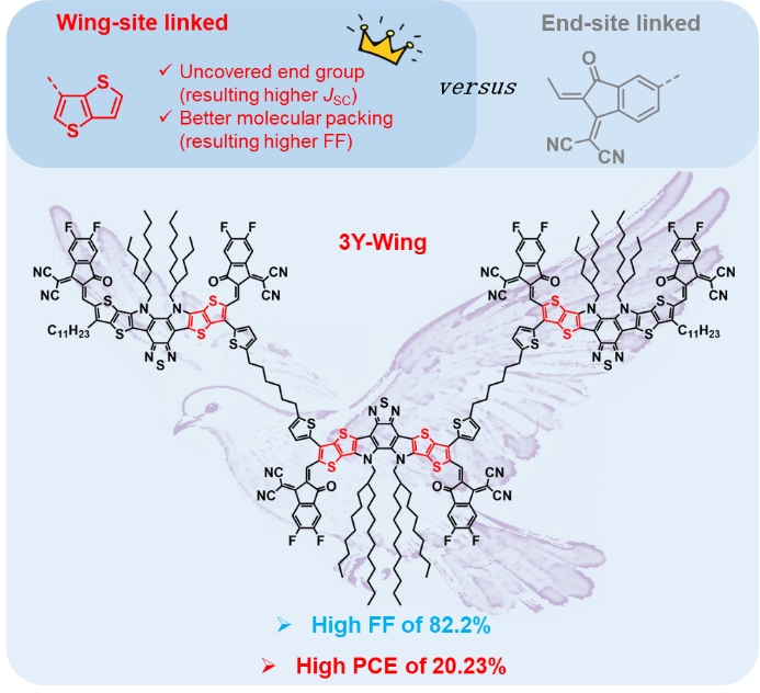 7. 2026年2月6日,凡群平教授、马伟教授和吴强助理教授联合湘潭大学、西安科技大学共同设计开发了一种“具有精细调节烷基连接位点”的非全共轭三聚受体用作制备有机太阳能电池,基于该受体体系实现了20.23%的高光电转化效率并且具有良好的工作稳定性,创下非全共轭三聚受体最高记录。相关工作以“Trimeric Acceptors with Fine-Tuned Alkyl-Linkage Sites for 20.23% Efficiency and Stable Organic Solar Cells”为题在国际知名期刊《德国应用化学》上在线发表。