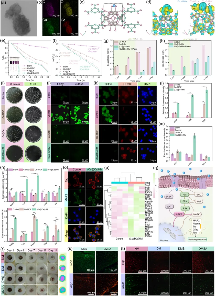 图2. (a) (b) (Cu@Ce)HM纳米颗粒微观形貌及元素分布,(c) Ce-MOF-808结构示意图,(d)不同角度下,Cu键合Ce-MOF电荷密度分布,(e) DPPH随时间降解曲线和代表性图像,(f) DPPH的拟合动力学曲线以及一级速率常数,(g) (h) pH = 7.4/5.8下,Ce离子和Cu离子在1,3天的释放量,(i) Ce-MOF, Cu@Ce及(Cu@Ce)HM纳米课题的典型菌落图像,(j) (k)巨噬细胞(RAW264.7)不同条件处理后的ROS染色及促炎因子(CD86)和抑炎因子(CD206)荧光染色的代表性图像,(l)不同样品处理损伤巨噬细胞条件培养基培养内皮细胞(HUVEC)细胞功能因子表达,(m)不同样品处理成纤维细胞(L929)功能因子表达,(n)不同样品处理损伤神经细胞(PC12)分化因子表达,(o)与H2O2损伤对照组(Control)和(Cu@Ce)HM组分化相关因子Tau/MAP荧光染色代表性图像,(p) (Cu@Ce)HM与Control组之间神经分化基因表达水平相对变热图,(q) (Cu@Ce)HM促进神经分化分子机制示意图,(r)不同处理条件/时间点糖尿病感染伤口代表性图像,(s)术后4天细菌感染糖尿病伤口有(DMSA)/无(DMS)(Cu@Ce)HM处理组促炎因子(iNOS)和抑炎因子(Arg-1)荧光染色代表性图像,(t)术后14天不同处理条件下伤口处神经(Tuj1)/血管(CD31)因子表达的代表性图像。
