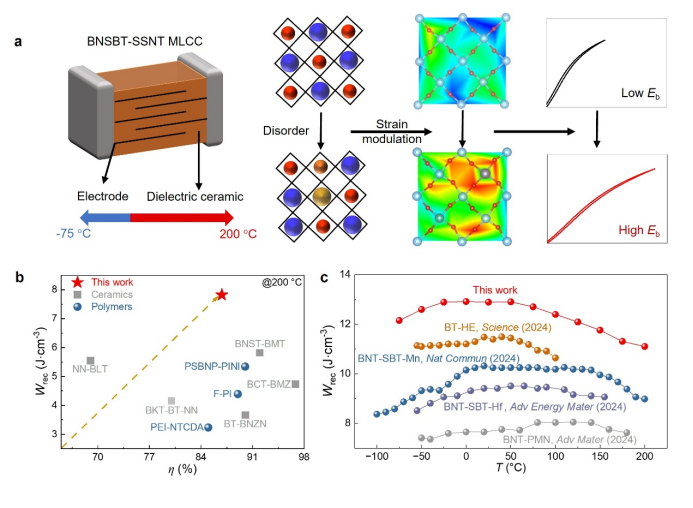 介电陶瓷电容器凭借其高功率密度与快速充放电特性,在电磁轨道炮、激光武器等脉冲功率系统中展现出广阔的应用前景。然而,随着电子设备不断向小型化、集成化方向推进,其较低的能量密度成为制约该类器件进一步发展的关键瓶颈。近年来,科研人员通过高熵组分设计、多态弛豫相构筑以及制备工艺优化等策略,在提升介电陶瓷电容器室温储能性能方面取得了显著进展。尽管如此,在航空航天、石油钻井等极端高温应用环境下,储能器件需在严苛条件下稳定工作,因此开发具有优异高温储能性能的介电陶瓷材料成为当前亟待突破的重要方向。
