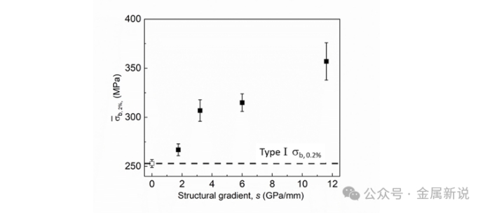 图2中4个不同样品的硬/软区体积分数相同,故这4个HS材料由ROM算得的I型背应力是一样的。但它们内部硬/软各片区的厚度不同,导致4个样品中的结构梯度(反映为单位长度内的硬度变化,GPa/mm)不同。图2的实验显示:II型背应力随结构梯度增大而显著增加:这一结果凸显了仅报告总背应力(如近期文献中的常规做法)的局限性。