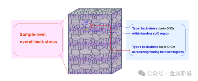 ii) 评估I型背应力(虚线):对仅含硬质(或软质)成分、组织的均质样品单独测试背应力,再根据硬/软区体积分数加权平均(ROM混合法则);